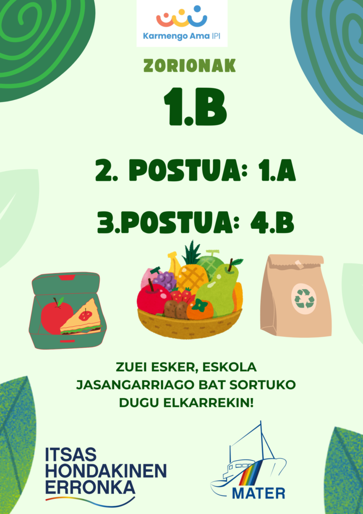 Iepa lagunak! Segurtatu genizuen bezala, txapelketako irabazlea atera zaigu. DBH 1.B klaseak irabazi du! Guretzat, ohore handia izan da, 20 pertsona gutxi gorabeherako klasean 2 plastiko soilik atera izana! Orain, idatzi bat prestatuko dugu ikasketaburuentzat, hurrengo urtean, egun ba bat proposatuko dugu plastikorik gabeko hamaiketakoa izateko.