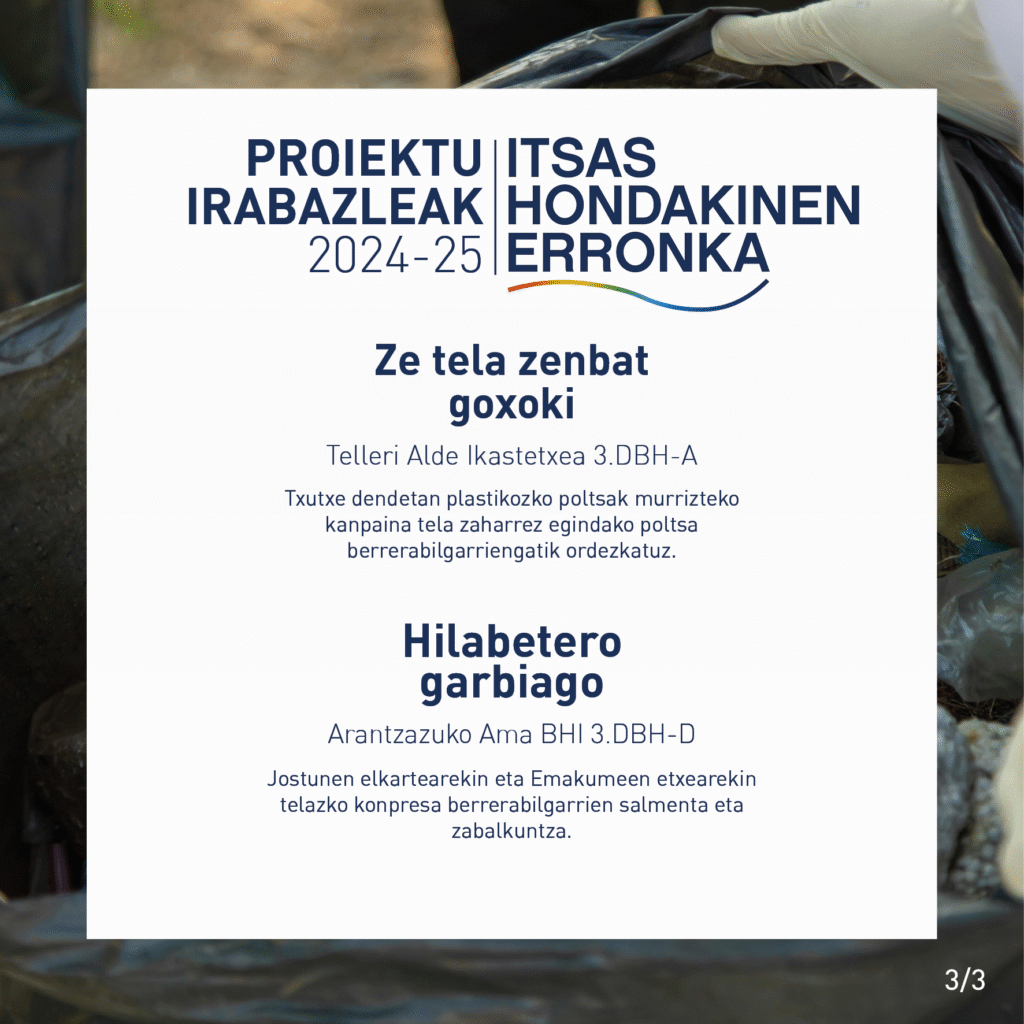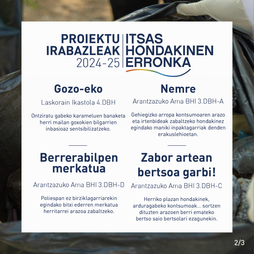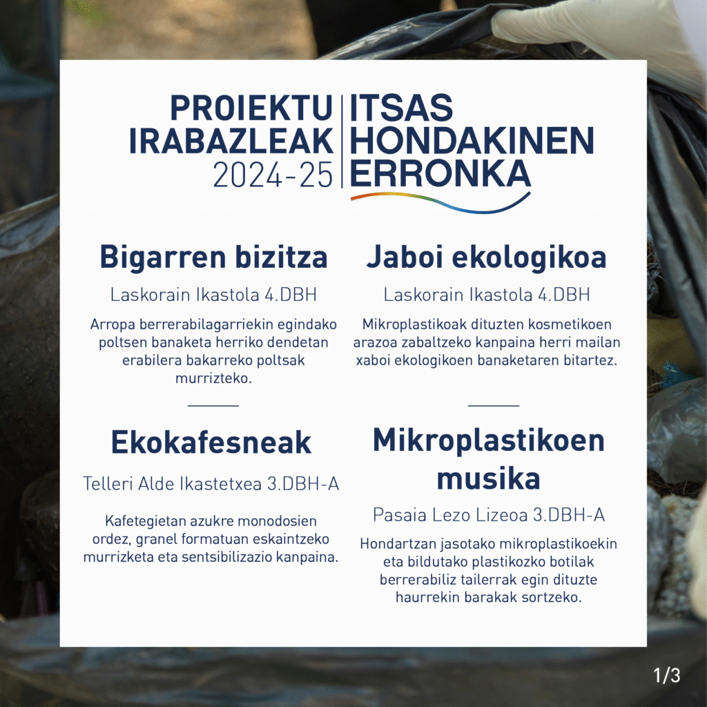 Ikasturte honetan zehar Gipuzkoako 6 zentroetako 3.DBH eta 4.DBH bitarteko 300 ikasle baino gehiagok itsas hondakinen arazoari aurre egiteko tokian tokiko 80 proiektu baino gehiago garatu dituzte, ingurumenaren zaintzako ekintzaile izanik eta aldaketaren protagonistak direla frogatuz.
